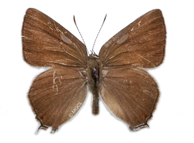 Butterfly: Wingspan: 1 - 1½ inches (3 - 3.8 cm) UPPER SURFACE (dorsal) Seldom seen. Light gray brown. Small orange spots on hindwing edge. UNDER SURFACE (ventral) Pale brown. Band of dark brown oval spots (not dashes) outlined in white on fore and hind wings. Blue hindwing tail-spot is typically not topped with orange, although sometimes there may be some red scales. Orange marking on inner hindwing edge. One tail on each hindwing; sometimes an additional very short tail.