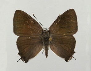 Butterfly: Wingspan: 1 - 1½ inches (2.5 - 3.8 cm) UPPER SURFACE (dorsal) Seldom seen. Brown. UNDER SURFACE (ventral) Gray brown; row of distinct dashes edged in white across both wings. Large blue hindwing patch capped in orange; orange-capped black spot near tails. Two short tails.