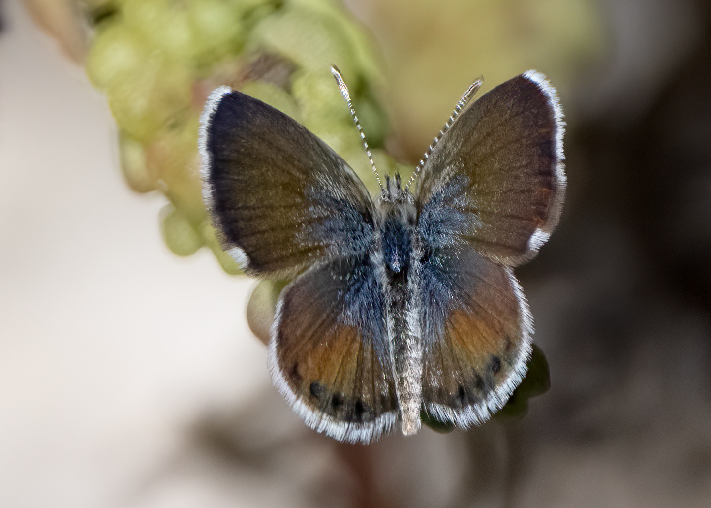 Butterfly: Wingspan: ½ - ¾ inch (1.2 - 2 cm) UPPER SURFACE (dorsal) Coppery brown with dull blue at bases of both wings. Female with less blue. Row of small spots at hindwing lower edge. UNDER SURFACE (ventral) Hindwing coppery brown with white at base; three or four small dark spots near body; row of black spots with metallic glints at outer margin. Wing fringe mostly white. Tiny.