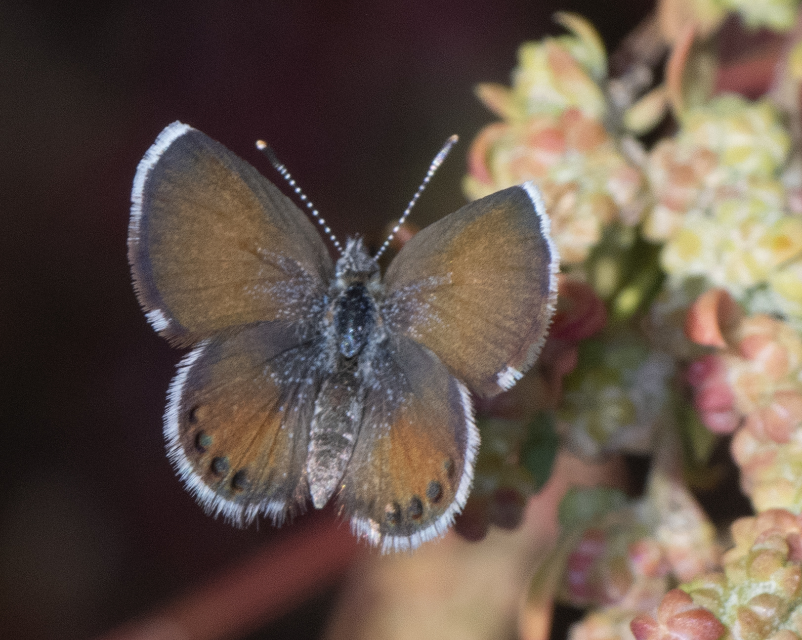 ID Tip: A very tiny, brown-and-gray (not blue) butterfly with white fringes.
