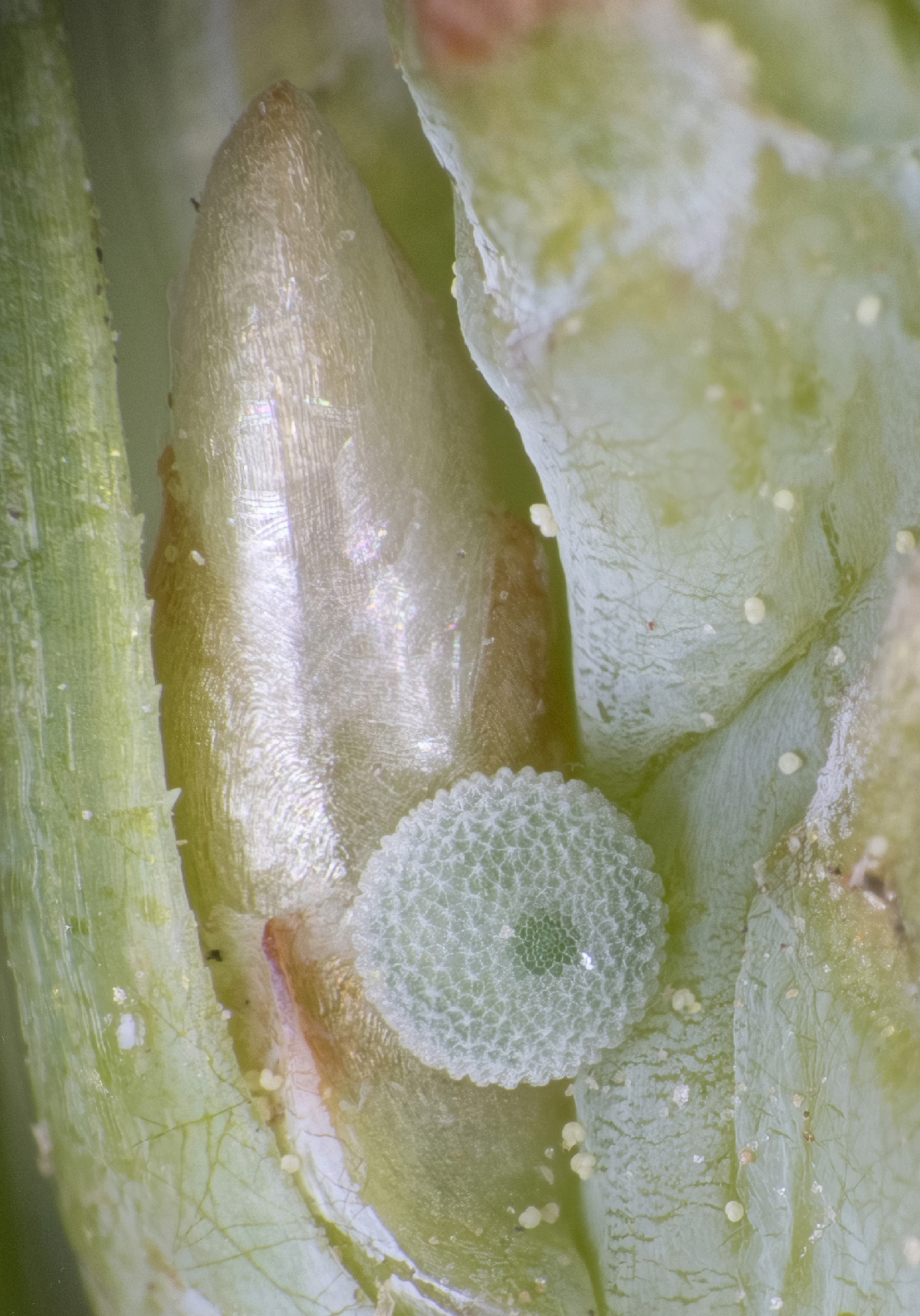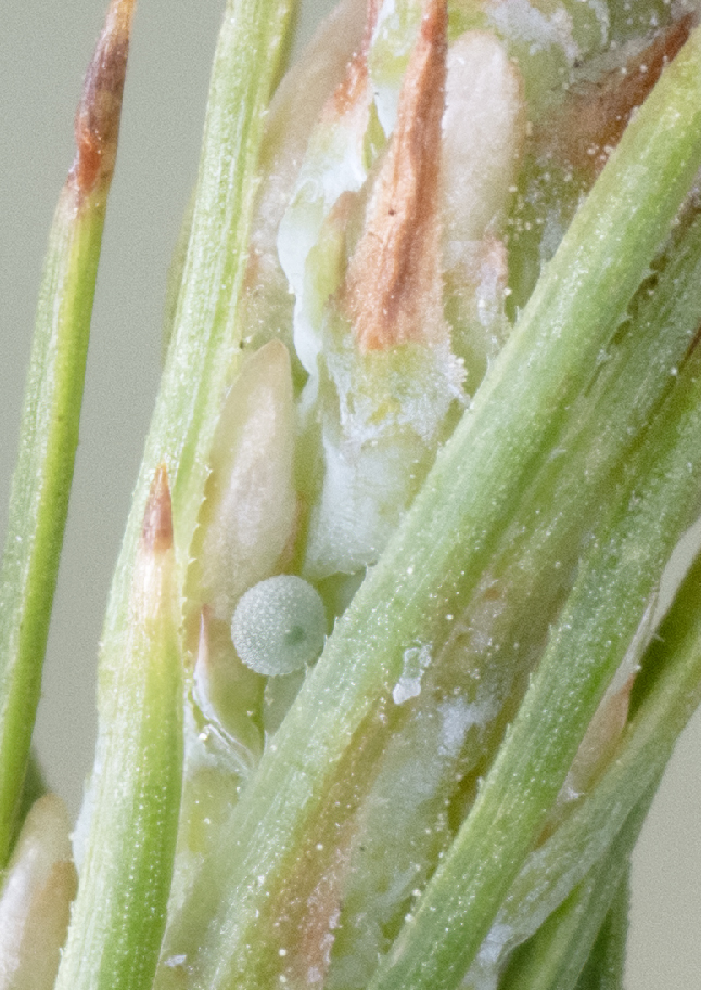 Egg: Pale green, flattened disc. Usually laid singly at the base of host needles.