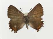 Butterfly: Wingspan: ¾ - 1¼ inches (1.9 - 3.2 cm) UPPER SURFACE (dorsal) Rarely seen. Male dark brown with forewing stigma patch. Female lighter brown. UNDER SURFACE (ventral) Brown; strongly marked with gray, reddish brown, and black chevrons and bands. No tails.