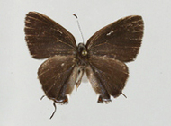 Butterfly: Wingspan: ¾ - 1 inch (1.9 - 2.5 cm). UPPER SURFACE (dorsal) Male slate gray; unmarked. Female gray with iridescent blue scaling. UNDER SURFACE (ventral) Light gray brown. Red or orange band edged with thin white line crosses hind and forewings; width varies. Blue patch and at least one black eyespot near double tails.