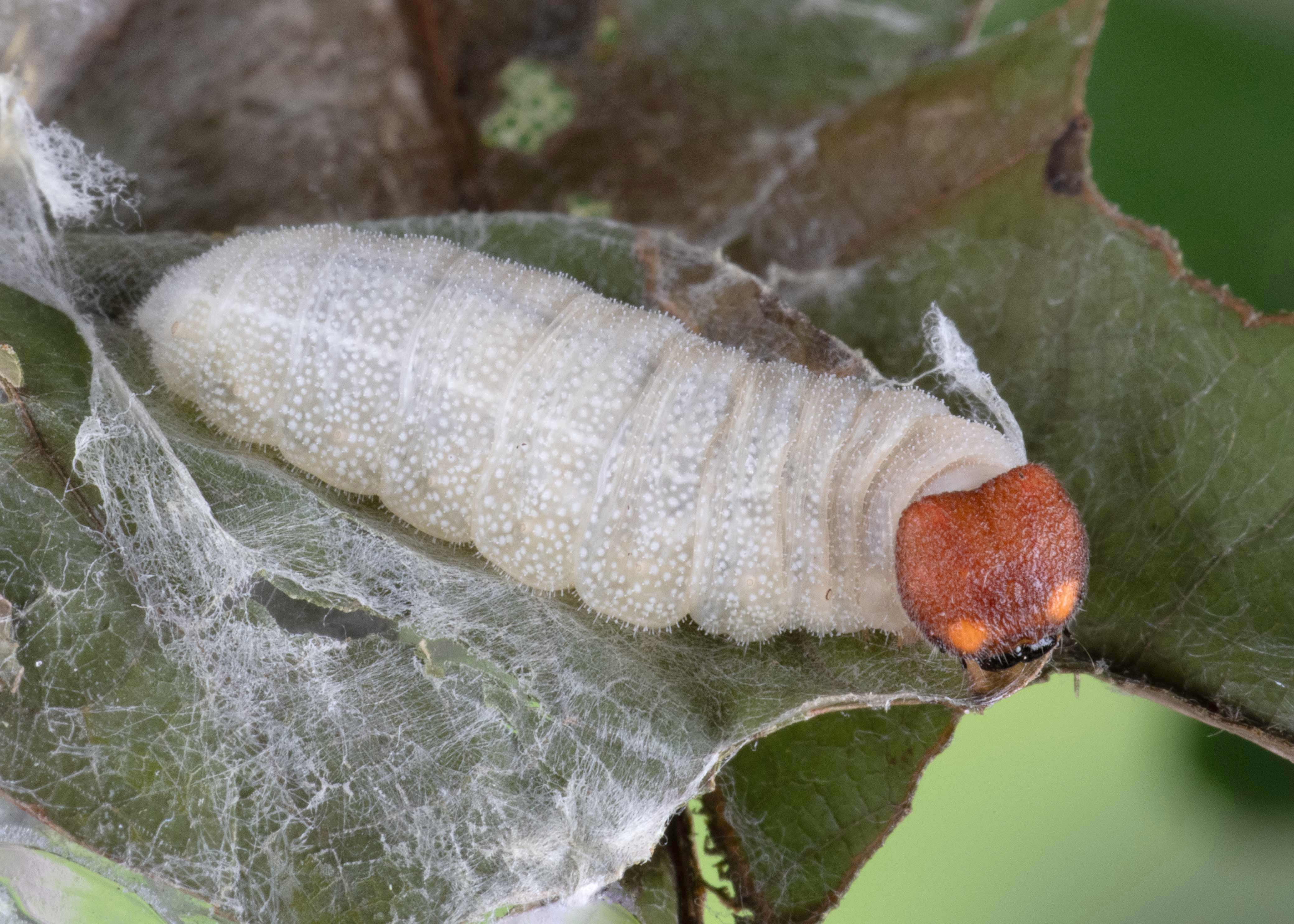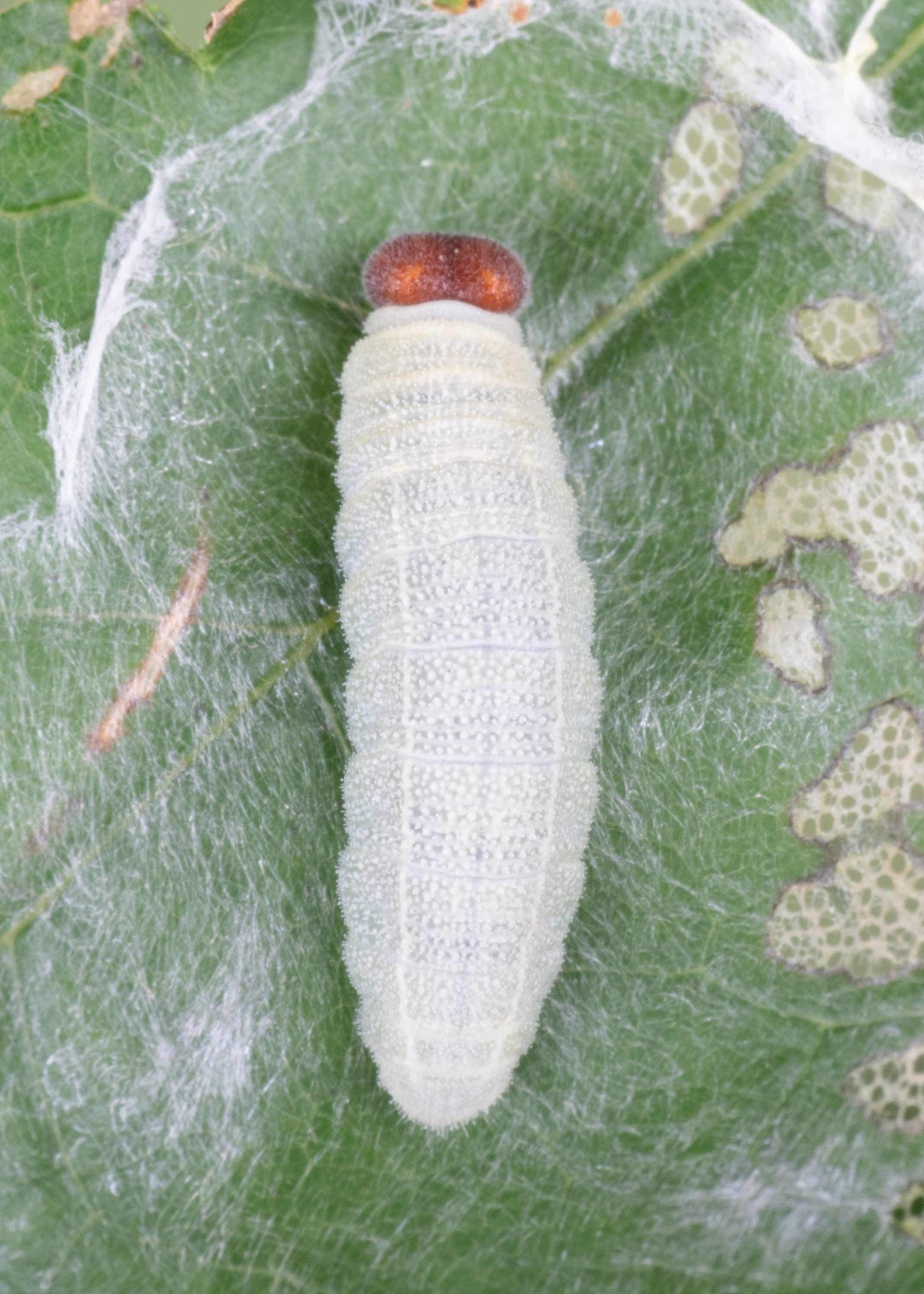 Female lay their eggs on or near the new growth of several oak species, typically scrub oaks. Caterpillars live within a shelter they construct by tying leaves together with silk. They develop slowly. Growth is not complete until fall when they quit eating and turn light brown. These final instars construct a shelter in a leaf that eventually falls from the tree, and the caterpillars spend the winter in the leaf litter on the ground. Pupation occurs in early spring.
